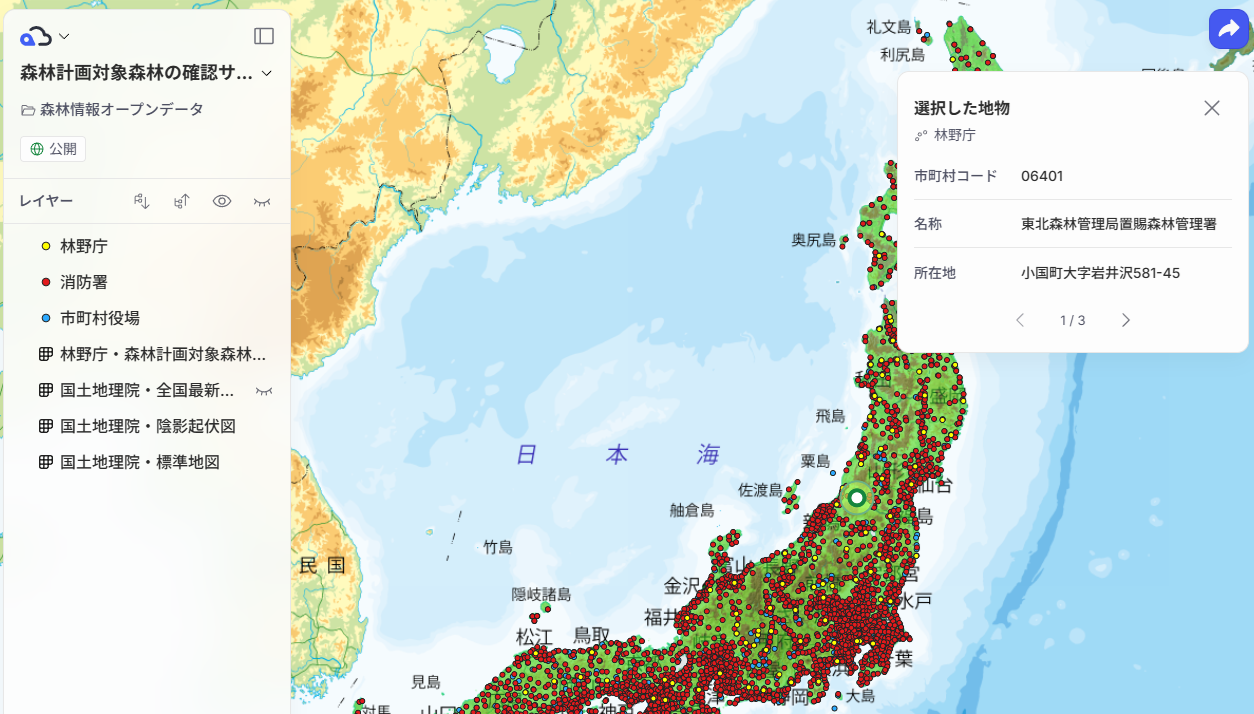 林野庁が公開した民有林(個人や法人が所有する森林)と国有林の区域が分かる「森林計画対象森林レイヤ」に、国土数値情報(国土交通省)が公開する行政機関データの中から、林野庁の出先機関(森林管理署等)や消防署、市町村役場の位置を重ねたWEB地図を作成しました。