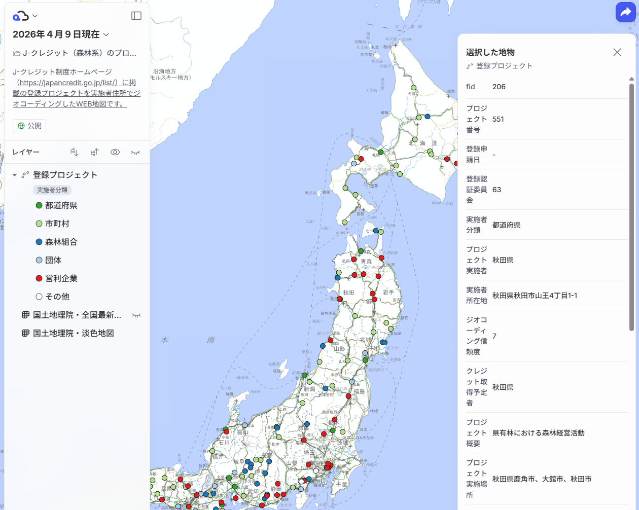 J-クレジット制度ホームページ()に掲載の登録プロジェクトを実施者住所でジオコーディングしたWEB地図です。