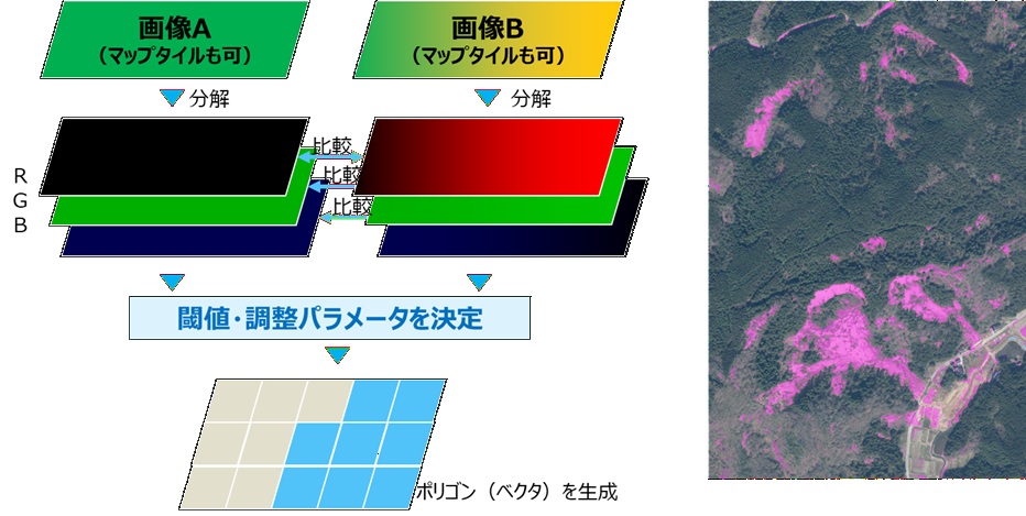 今回作成したChangePolygonizerは、RGB値(3値)をそのまま使用し、2時期の空中写真/衛星画像のRGB値変化から地表変化部分のポリゴンを生成するプラグインとしています。そして、解析結果をポリゴン(ベクタ)データで出力できます。