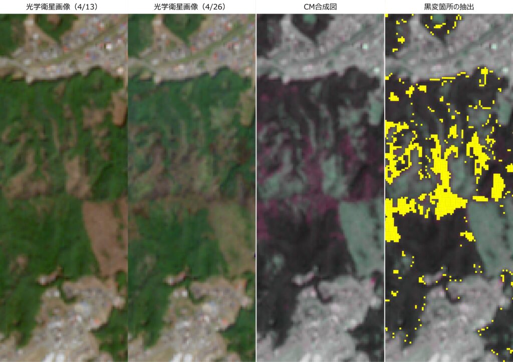 なお、本解析には、Forestgeo.info開発のQGISプラグインCM Change Detectorを使用しています。黒変箇所が赤みを帯びるという特徴量を掴むことができました。